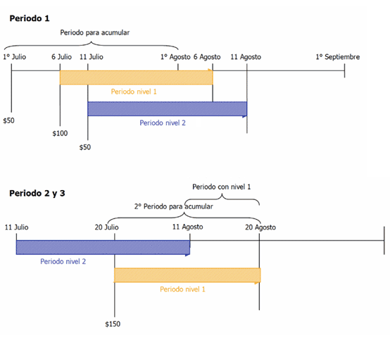 Periodo 2 y 3: el siguiente periodo para acumular comenzará con la siguiente recarga del usuario que en este caso se realiza el 20 de julio, como el nivel 2 termina el 11 de julio el usuario tendrá el nivel 1 del 11 al 20 de agosto.